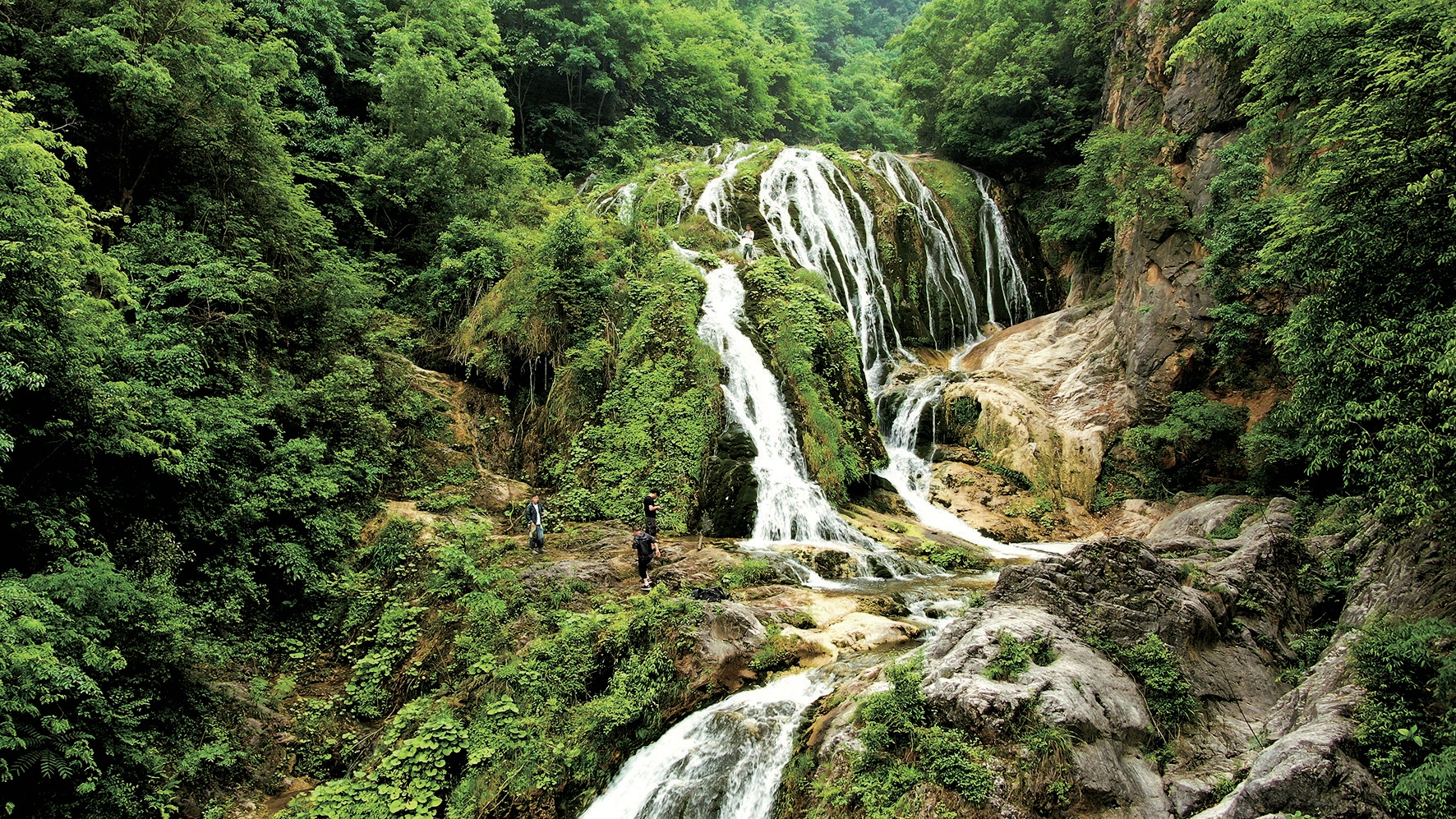 順著溪流下行半個(gè)多小時(shí),一條十幾米寬的激流被陡峭山崖阻擋后形成無數(shù)分支,從約20米高的大型鈣化梯坎上跌落。這是該河段最為壯觀的一處瀑布,氣勢(shì)磅礴,聲聞十里,如戰(zhàn)鼓擂動(dòng)、萬馬奔騰。