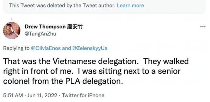 在埃諾斯的推文下面,同樣在現(xiàn)場(chǎng)參會(huì)的前美國(guó)國(guó)防部官員唐安竹直接辟謠稱:“那是越南代表團(tuán),他們走的時(shí)候還經(jīng)過(guò)了我的座位。我當(dāng)時(shí)正坐在中國(guó)代表團(tuán)一位大校軍官旁邊”。
