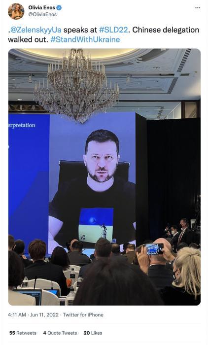 5月,澤連斯基在瑞士達(dá)沃斯舉辦的世界經(jīng)濟(jì)論壇也進(jìn)行了一場(chǎng)演講,當(dāng)時(shí),美國(guó)有線電視新聞網(wǎng)(CNN)發(fā)布了一篇報(bào)道,謊稱澤連斯基視頻演講結(jié)束時(shí)全場(chǎng)起立鼓掌,唯獨(dú)中國(guó)代表團(tuán)未起立鼓掌,并離場(chǎng)。