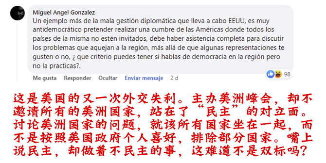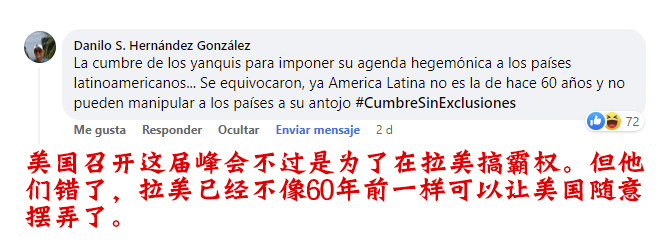 拉美網(wǎng)友紛紛在海外社交媒體上留言“補(bǔ)刀”。他們給美國(guó)政府貼上了“獨(dú)裁”“假民主”“侵犯人權(quán)”等標(biāo)簽,認(rèn)為此次洛杉磯峰會(huì)得不到大家的“祝?!保瑢?shí)乃美國(guó)自食惡果、自作自受。