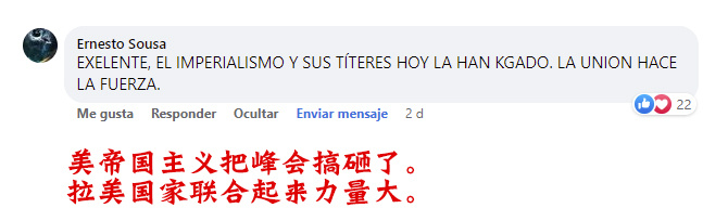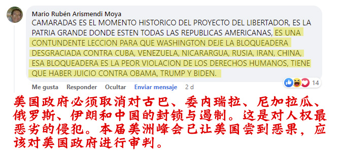 會(huì)場(chǎng)外,上千名示威者高呼口號(hào),反對(duì)美國(guó)政府對(duì)古巴等拉美國(guó)家的制裁,拉美各國(guó)網(wǎng)友更是在海外社交媒體上火力全開,花式吐槽美國(guó),觀點(diǎn)犀利火辣。