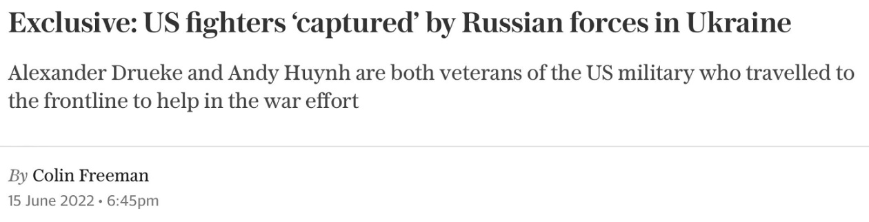 據(jù)報道,兩名被俘的美國人名叫亞歷山大·德魯克和安迪·胡因。一名與他們共同參戰(zhàn)的士兵稱,兩人于本月9日在哈爾科夫市附近作戰(zhàn)時被俘。據(jù)稱,他們作為志愿兵在一個烏軍正規(guī)部隊服役。