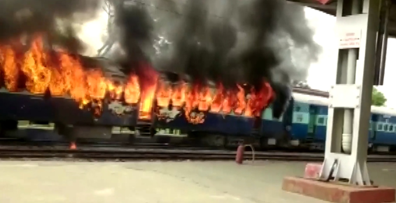 視頻截圖:印度示威者點(diǎn)燃火車車廂