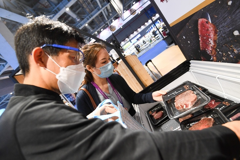 ↑2020年11月7日,在第三屆進博會食品及農(nóng)產(chǎn)品展區(qū)綠地食品館,工作人員(左)向參觀者介紹南非牛肉。新華社記者 陳曄華 攝