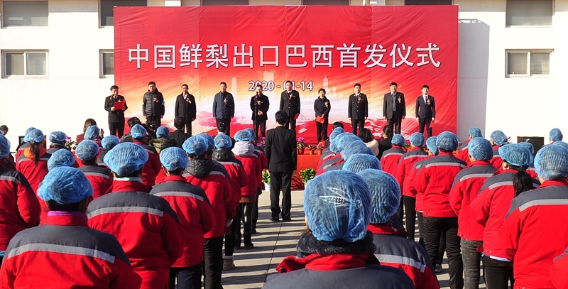 ↑2020年1月14日,中國鮮梨出口巴西首發(fā)儀式在河北滄州泊頭東方果品有限公司舉行。巴西位于南半球,與中國水果生產(chǎn)具有季節(jié)互補性。新華社記者 牟宇 攝