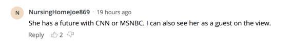 網(wǎng)友NursingHomeJoe869:她很適合CNN和MSNBC(微軟-全國廣播公司)。我都能想象她上《觀點(diǎn)》(美國廣播公司訪談欄目)當(dāng)嘉賓的樣子。