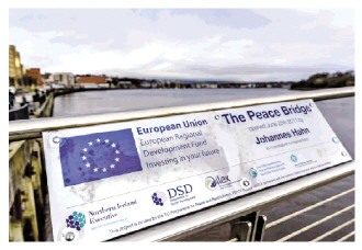 圖為在英國北愛爾蘭第二大城市德里拍攝的“和平”橋標牌。 新華社記者 韓巖 攝