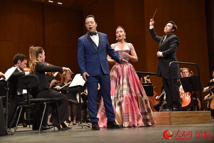 | 中國男高音魯智全和法國女高音厄米尼·勃朗德爾共同獻唱。人民網(wǎng)記者 劉玲玲攝 |