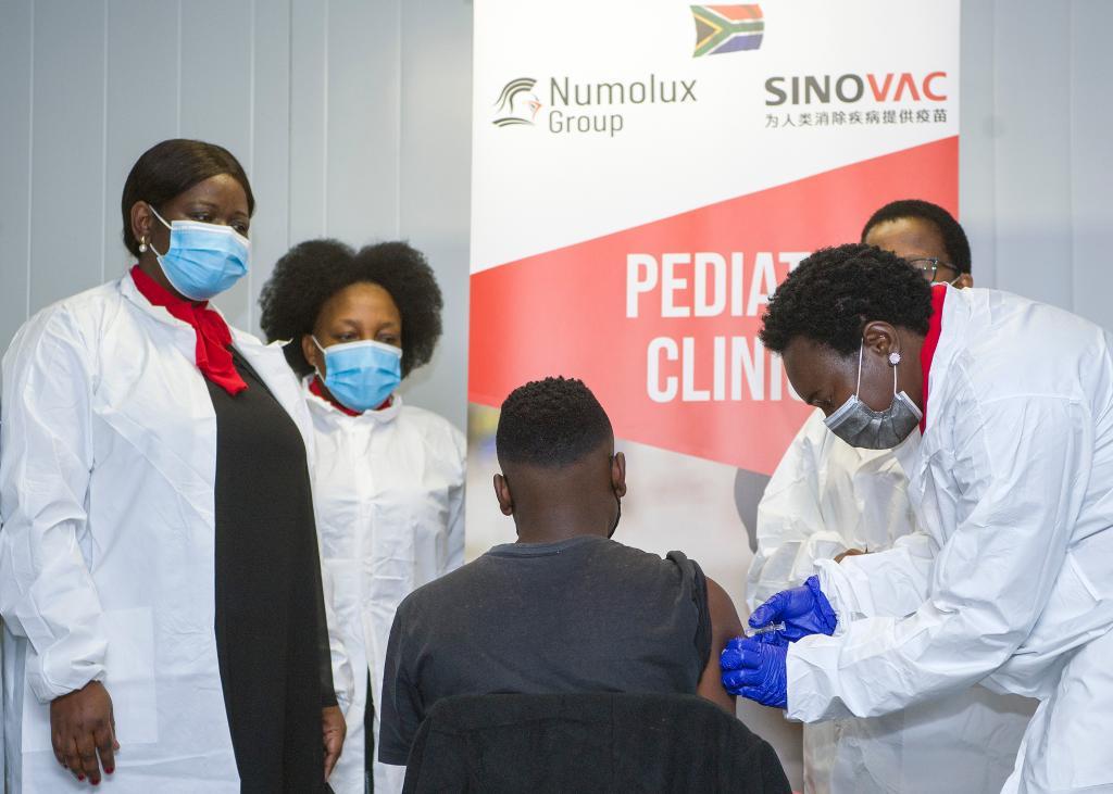 2021年9月10日,在南非比勒陀利亞,醫(yī)務(wù)人員給首名青少年志愿者注射第一劑科興疫苗。新華社記者 陳誠(chéng) 攝
