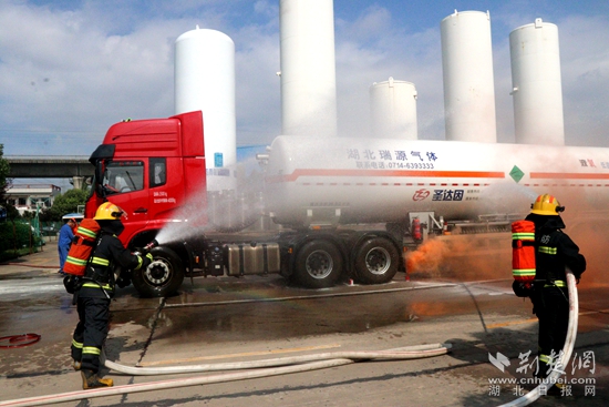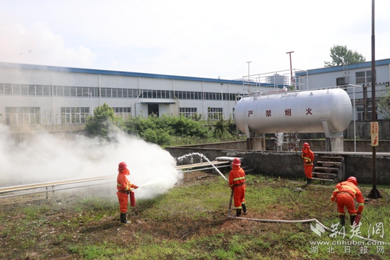 演練模擬高溫天氣工人裝卸液化氣操作不當(dāng),引發(fā)火災(zāi),火勢(shì)蔓延危及臨近廠區(qū)安全。企業(yè)隨即啟動(dòng)應(yīng)急救援預(yù)案,組織企業(yè)微型消防站撲救初起火災(zāi)并撥打119進(jìn)行報(bào)警。