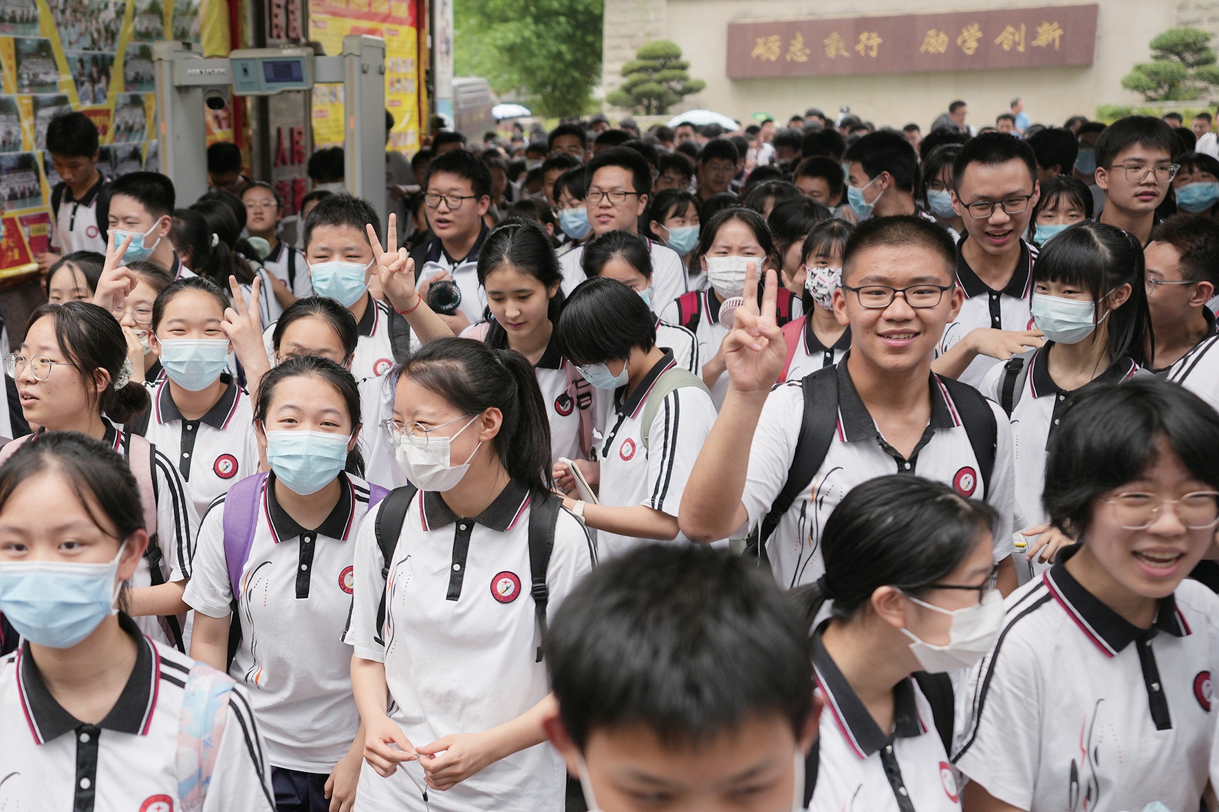 學生們邁著輕松的步伐,面帶笑容走出考場。