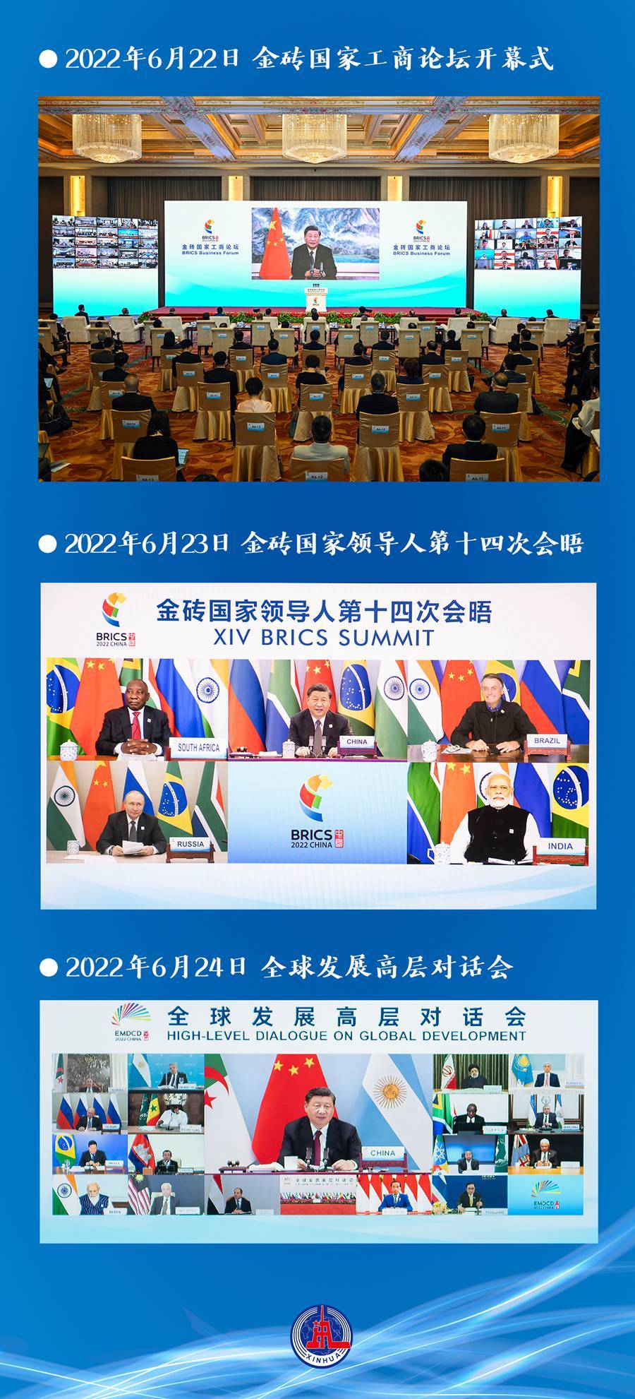 6月22日至24日,金磚“中國年”的高光時段,連續(xù)三個晚上,習近平主席以視頻方式相繼出席金磚國家工商論壇開幕式,主持金磚國家領(lǐng)導人第十四次會晤、全球發(fā)展高層對話會。