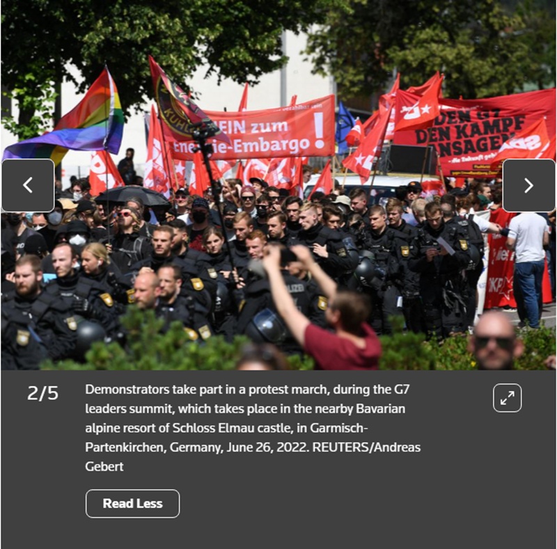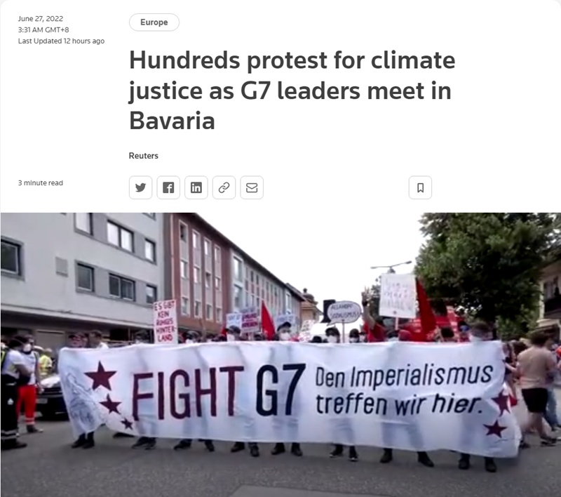 6月26日,德國(guó)加米施-帕滕基興小鎮(zhèn),民眾參加反對(duì)七國(guó)集團(tuán)的示威游行。(來(lái)源:路透社報(bào)道截圖)