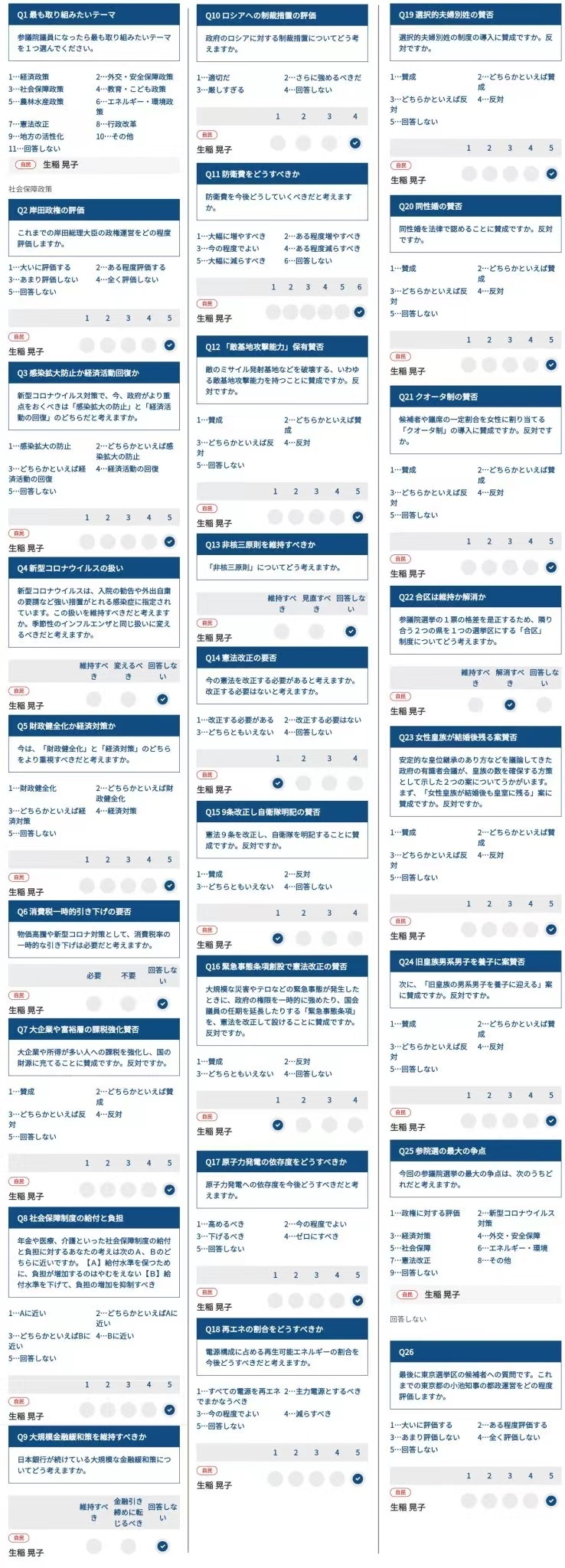 還有日本網(wǎng)友發(fā)現(xiàn),日本廣播協(xié)會(huì)(NHK)參議院選舉專題網(wǎng)站上刊載的面向候選人的調(diào)查問卷結(jié)果顯示,生稻晃子在回答“是否支持降低消費(fèi)稅”等問題時(shí),基本上選擇了“不做回答”選項(xiàng)。根據(jù)NHK網(wǎng)站28日顯示的最新結(jié)果,在全部的26個(gè)問題中,生稻晃子對(duì)21個(gè)問題選擇“不做回答”。