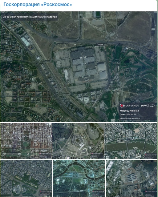 “今天北約峰會(huì)將在馬德里開幕,西方國家將在峰會(huì)上宣布俄羅斯為主要敵人?!倍韲液教旒瘓F(tuán)公司當(dāng)天在Telegram上寫道,“在該聯(lián)盟30個(gè)成員國及其伙伴、北約候選國研究到2030年的戰(zhàn)略構(gòu)想之前,俄國家航天集團(tuán)公司發(fā)布峰會(huì)舉辦地和那些支持烏克蘭民族主義分子的‘決策中心’的衛(wèi)星圖?!?這些衛(wèi)星圖均由俄“資源-P”地球遙感衛(wèi)星拍攝。
