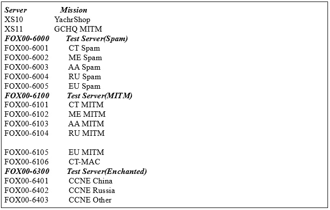 值得注意的是,編號為XS11的服務器被明確分配給英國情報機構“英國政府通信總部”(GCHQ)開展中間人網絡攻擊行動。此外,TAO針對中國和俄羅斯目標設置了專用的“酸狐貍平臺”服務器,編號為FOX00-64的系列服務器被用于支援計算機網絡入侵行動隊的漏洞攻擊行動,其中編號為FOX00-6401的服務器專門針對中國目標,F(xiàn)OX00-6402的服務器專門針對俄羅斯目標。