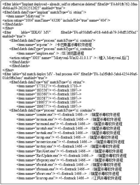 此外,根據(jù)“酸狐貍平臺”服務器上的過濾器規(guī)則片段,可以判斷該服務器主要針對中國的主機目標進行攻擊,過濾器中重點針對目標環(huán)境中的卡巴斯基殺毒軟件、瑞星殺毒軟件、江民殺毒軟件等中國地區(qū)流行的殺毒軟件進程進行了匹配并進行了可植入條件判斷。