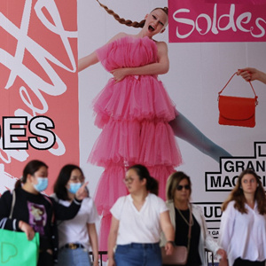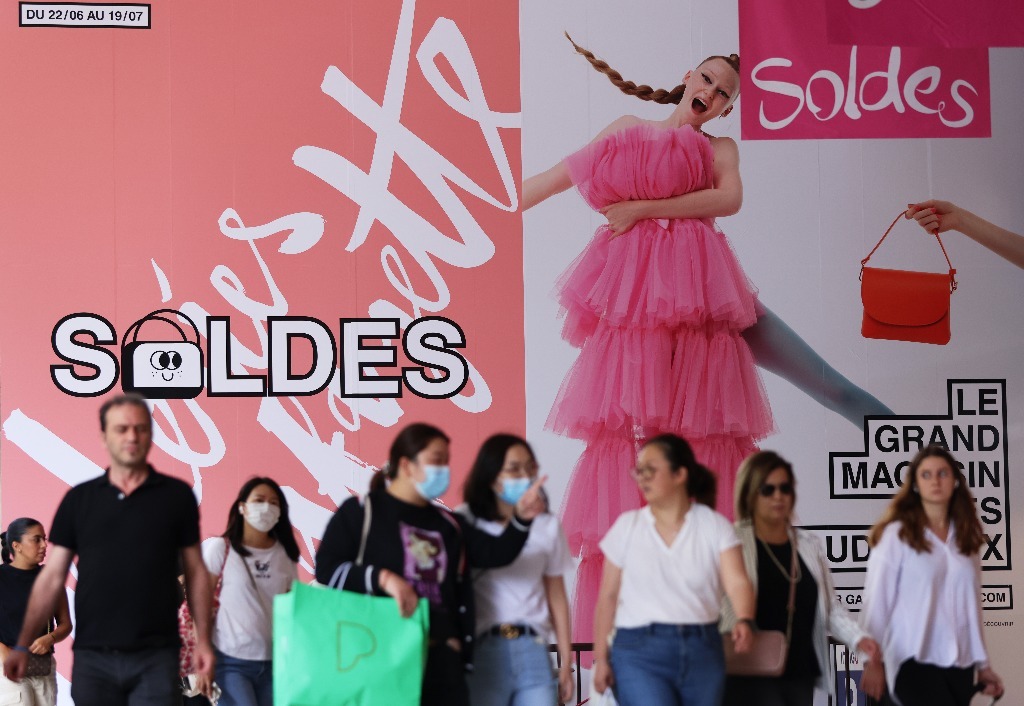 6月22日,在法國巴黎奧斯曼大道,人們走過老佛爺百貨商場(chǎng)前的打折季廣告。新華社記者高靜攝