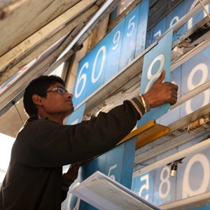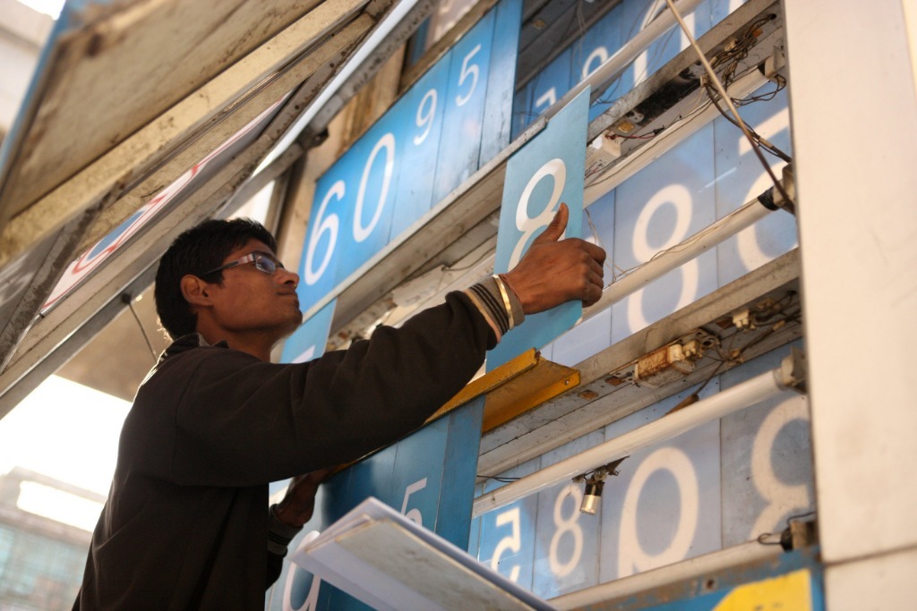 2011年1月16日,印度首都新德里一家加油站的員工在更新價格。新華社記者李毅剛攝