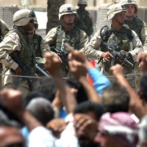 這是2003年6月18日,美軍士兵在伊拉克首都巴格達(dá)美英聯(lián)軍臨時(shí)總部門前持槍面對(duì)數(shù)百名示威的伊拉克人。新華社記者趙建偉攝