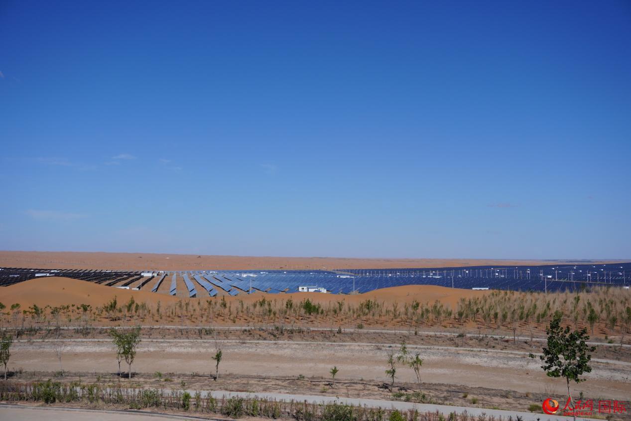 | 中衛(wèi)市沙漠光伏產(chǎn)業(yè)園中如碧湖般泛藍(lán)的太陽能光伏板。人民網(wǎng)記者 何蒨攝 |