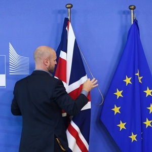 2019年10月17日,在比利時布魯塞爾的歐盟總部,工作人員整理英國和歐盟的旗幟。新華社記者鄭煥松攝
