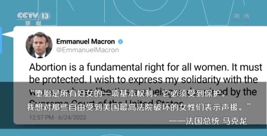 法國(guó)總統(tǒng)馬克龍表示:“墮胎是所有婦女的一項(xiàng)基本權(quán)利。它必須受到保護(hù)。我想對(duì)那些自由受到美國(guó)聯(lián)邦最高法院破壞的女性們表示聲援。”