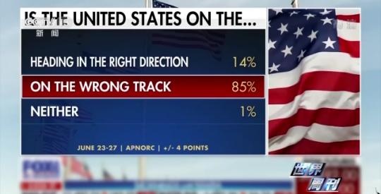 另?yè)?jù)美聯(lián)社-NORC公共事務(wù)研究中心6月末公布的一項(xiàng)最新民意調(diào)查顯示,高達(dá)85%的受訪者認(rèn)為,美國(guó)正走在錯(cuò)誤的道路上。其中79%的受訪者認(rèn)為美國(guó)的經(jīng)濟(jì)將變得更加糟糕。
