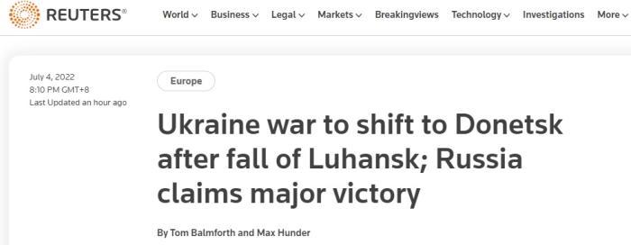 盧甘斯克失守,俄軍宣布重大勝利,烏克蘭之戰(zhàn)向頓涅茨克轉(zhuǎn)移。圖片來源:路透社報(bào)道截圖