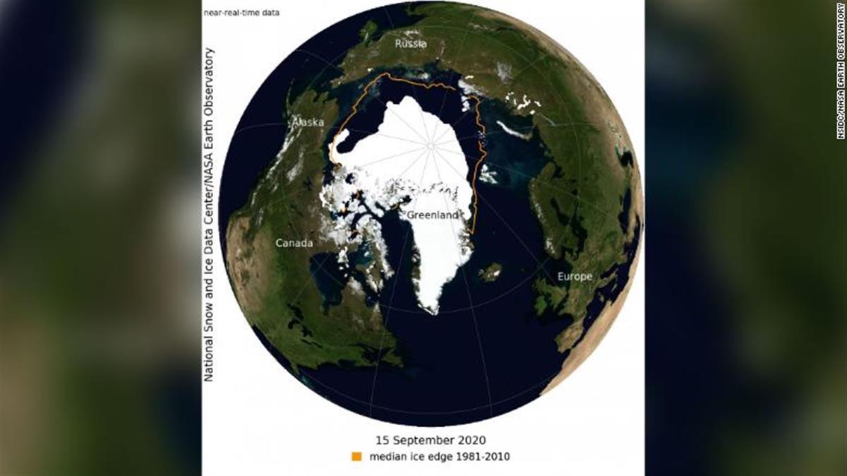 美國(guó)國(guó)家航空航天局發(fā)布了2020年9月15日測(cè)量的北極海冰范圍,是當(dāng)年的最低值 (圖片來源:CNN)
