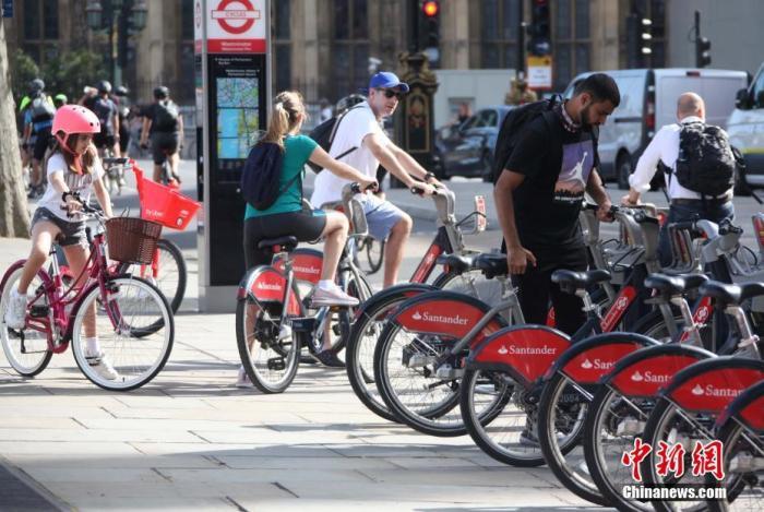 2020年7月29日,在英國(guó)首相鮑里斯·約翰遜于本周向民眾宣布免費(fèi)發(fā)放“50鎊自行車維修代金券”計(jì)劃后,倫敦大街小巷興起“自行車騎行熱”。圖為街邊四處停放的自行車,成為人們出行的主要交通工具。 中新社記者 張平 攝