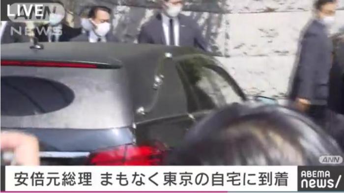 當(dāng)?shù)貢r間9日下午,載有日本前首相安倍晉三遺體的靈車抵達其位于東京的住宅。圖片來源:日本朝日電視臺報道截圖