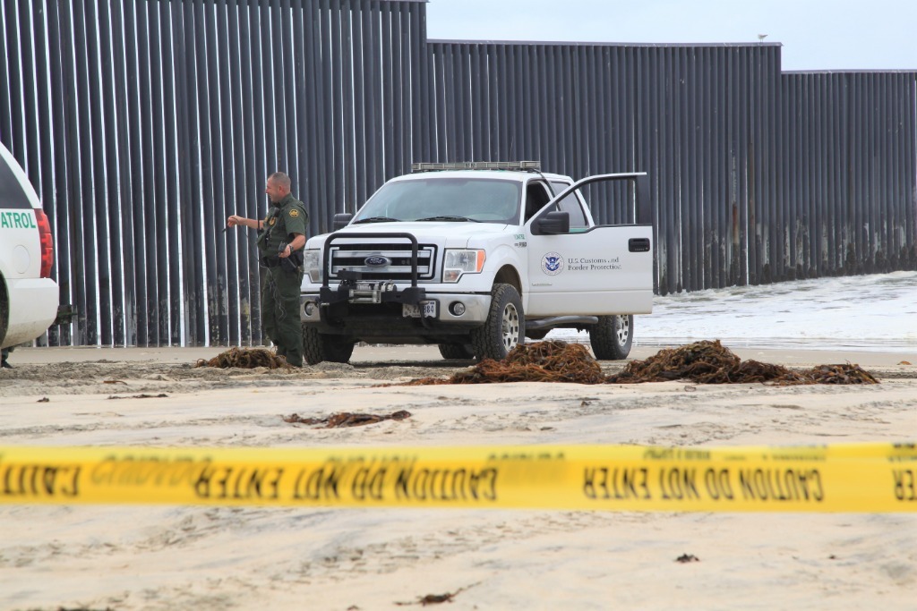 2018年4月30日,在圣迭戈美墨邊境墻美國一側(cè),美國警察在執(zhí)勤。新華社記者黃恒攝