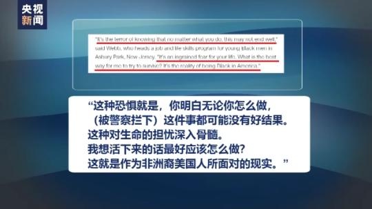 非洲裔美國人克爾溫·韋布:這種恐懼就是,你明白無論你怎么做,(被警察攔下)這件事都可能沒有好結(jié)果。這種對生命的擔(dān)憂深入骨髓。我想活下來的話最好應(yīng)該怎么做?這就是作為非洲裔美國人所面對的現(xiàn)實(shí)。