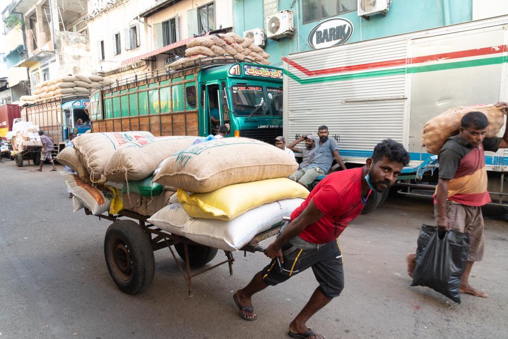 5月21日,工人在斯里蘭卡科倫坡貝塔市場搬運(yùn)貨物。(新華社記者唐璐攝)