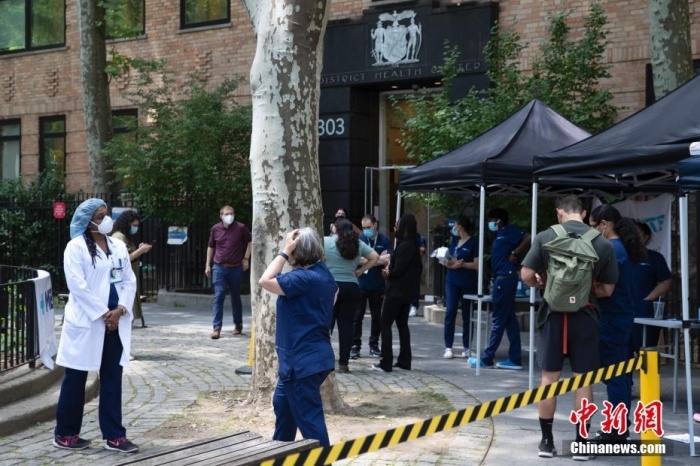 當(dāng)?shù)貢r間6月24日,美國紐約市政府在曼哈頓開設(shè)臨時診所,為易感人群接種猴痘疫苗。圖為診所醫(yī)務(wù)工作者準(zhǔn)備接待來訪公眾。 中新社記者 廖攀 攝