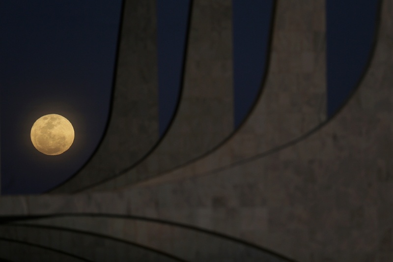 ↑“超級月亮”現(xiàn)身巴西首都巴西利亞的總統(tǒng)府上空。新華社發(fā)(盧西奧·塔沃拉攝)