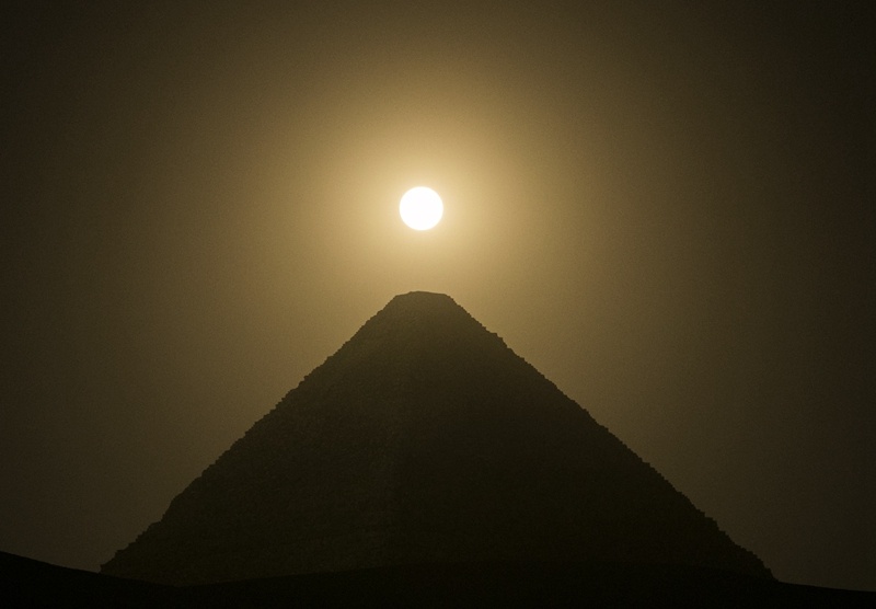 ↑“超級月亮”現(xiàn)身埃及吉薩胡夫大金字塔上空。新華社記者 隋先凱 攝