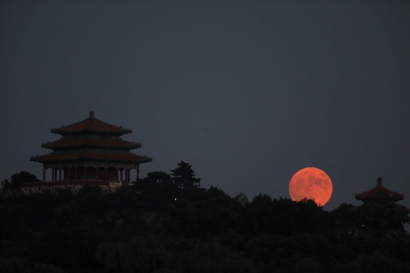 ↑“超級月亮”現(xiàn)身北京北海公園上空。新華社記者 程婷婷 攝