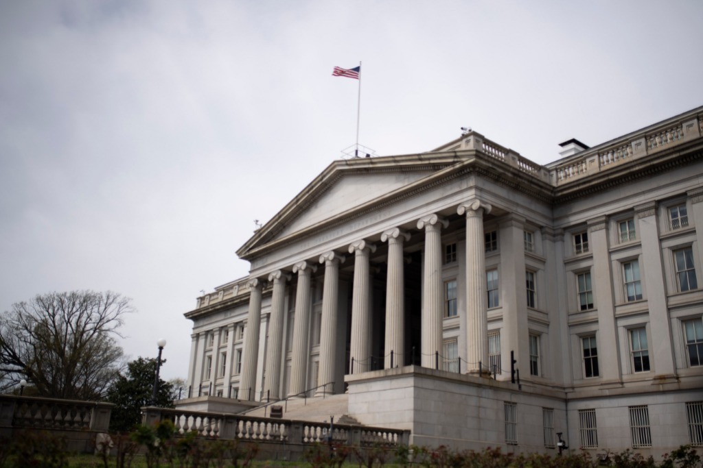 2020年3月27日在美國(guó)首都華盛頓拍攝的美國(guó)財(cái)政部大樓。新華社記者劉杰攝