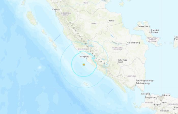 地震震中位于蘇門答臘島明古魯市(Bengkulu)西南偏南38公里(南緯4.13度,東經(jīng)102.162度)處。