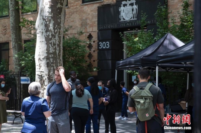 當(dāng)?shù)貢r(shí)間6月24日,美國(guó)紐約市政府在曼哈頓開設(shè)臨時(shí)診所,為易感人群接種猴痘疫苗。圖為公眾咨詢猴痘疫苗接種事項(xiàng)。 中新社記者 廖攀 攝