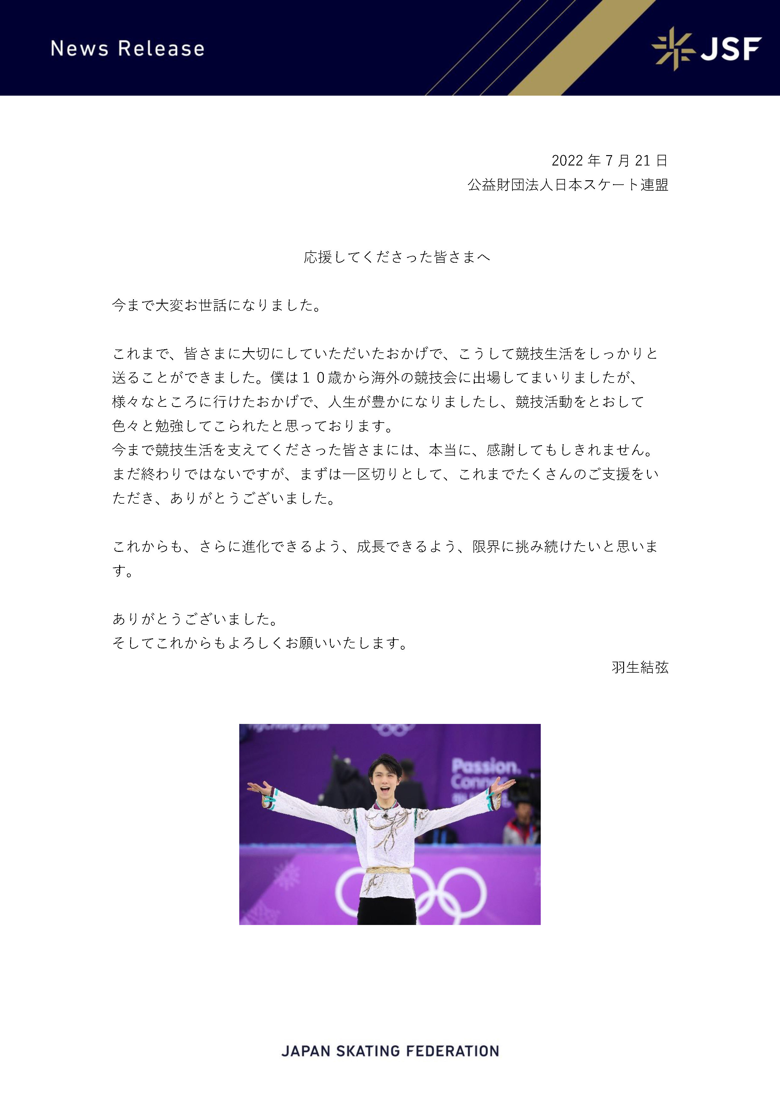 中新網(wǎng)北京7月21日電 21日,日本滑冰聯(lián)盟(JSF)發(fā)布了羽生結(jié)弦給支持者們的感謝信。他坦言,非常感謝大家一直以來的支持與幫助,正因如此,他才能好好度過了競技生涯。