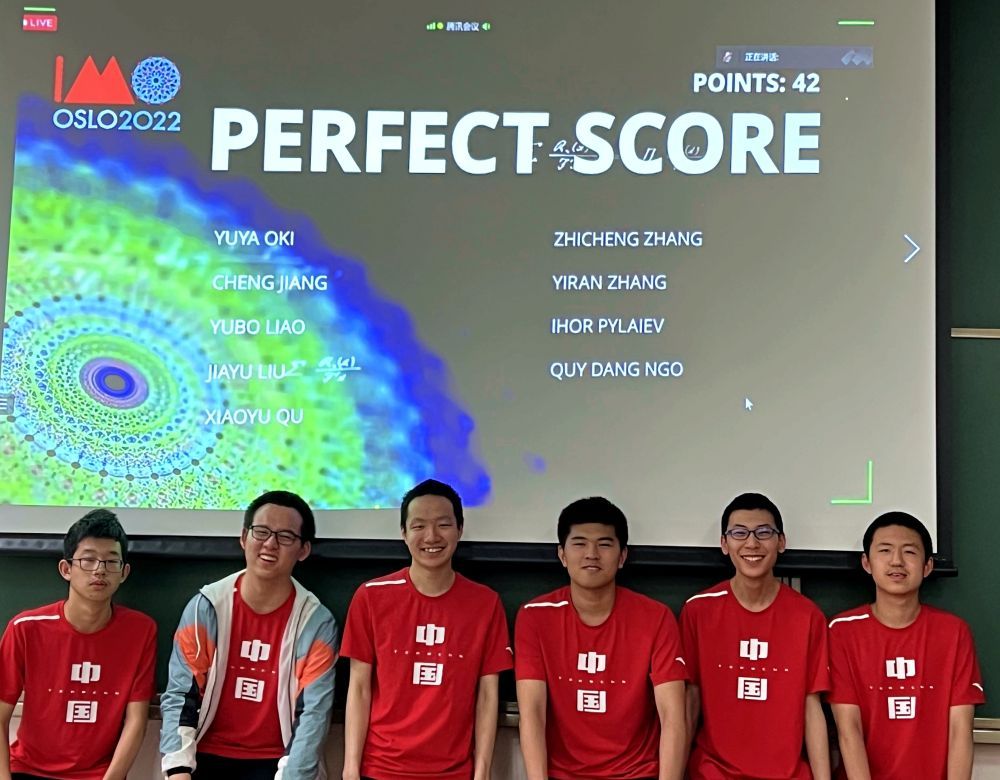 圖為中國(guó)數(shù)學(xué)奧林匹克國(guó)家隊(duì)6名隊(duì)員在成績(jī)屏前合影。