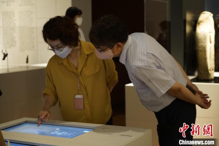 圖為當?shù)貢r間7月21日,參觀者在韓國國立中央博物館美索不達米亞陳列館的預展上觀看電子講解?!⑿?攝