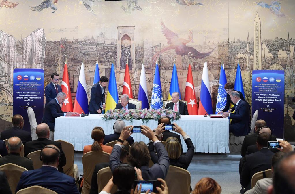 7月22日,在土耳其伊斯坦布爾多爾瑪巴赫切宮,土耳其國(guó)防部長(zhǎng)阿卡爾(右)、聯(lián)合國(guó)秘書(shū)長(zhǎng)古特雷斯(中左)與俄羅斯國(guó)防部長(zhǎng)紹伊古(左)在簽署協(xié)議。新華社記者沙達(dá)提攝