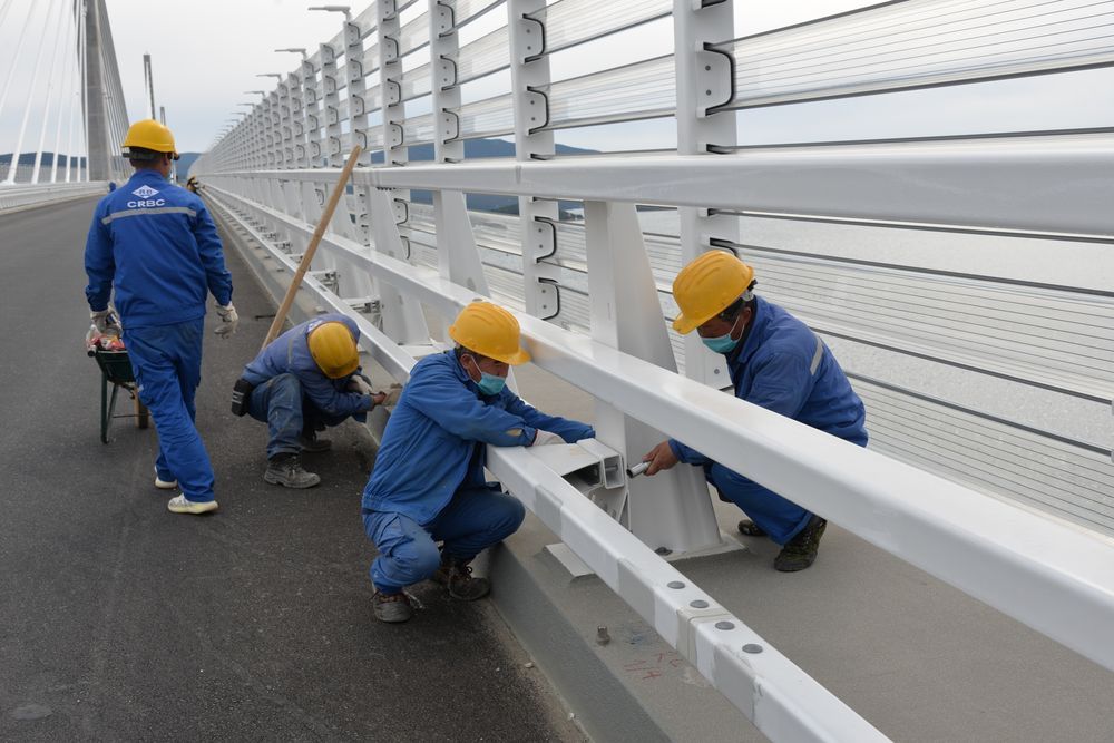↑2022年4月20日,施工人員在佩列沙茨大橋上加固外側(cè)防撞護欄。新華社記者李學軍攝
