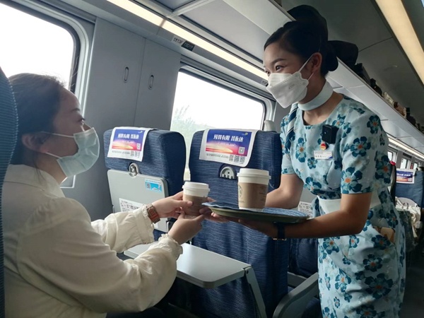 7月27日,列車員依波逢為旅客遞上一杯咖啡。新華網(wǎng)記者 侯強(qiáng) 攝