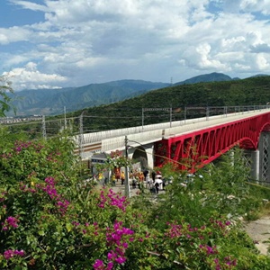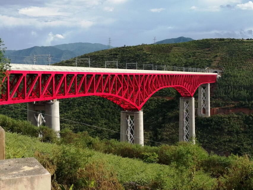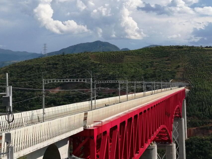盛夏的哀牢山樹木蔥郁,湍急的元江水從峽谷中流過。中老鐵路元江雙線特大橋橫跨哀牢山的兩座山峰,紅色的鋼鐵橋身橫亙在元江之上,將隔江相望的兩座山峰連接起來,一段天塹變通途。