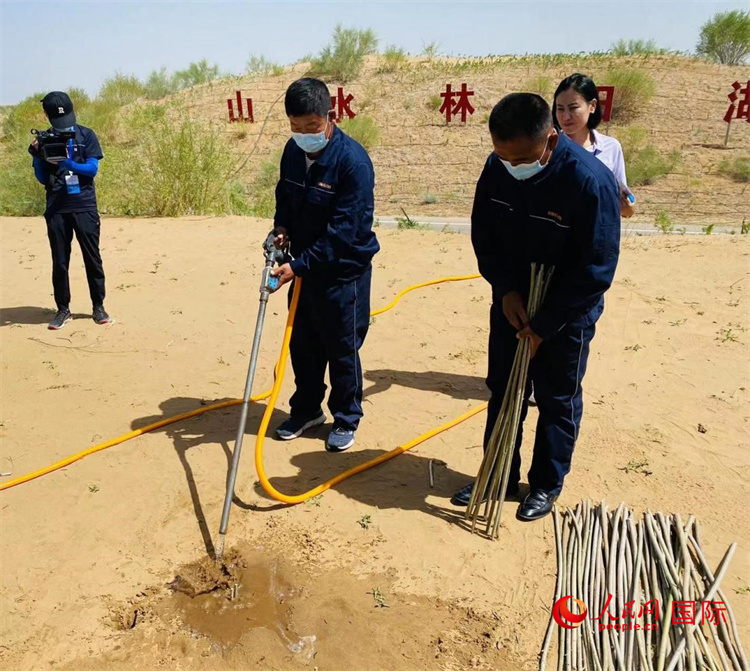 治沙工人使用微創(chuàng)氣流植樹法栽種。人民網(wǎng)記者 吳思萱攝